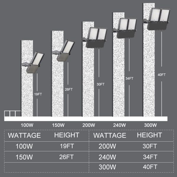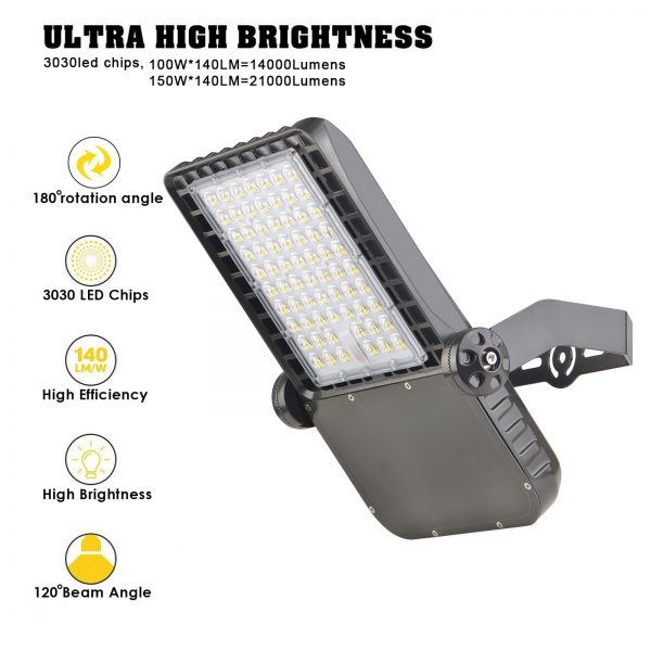 BUILT TO LAST – 100,000 LED saves having to replace bulbs- Aluminum Housing with high tech Heat Sink. Better Heat dissipation ensures longer LED life and safety. IP65 Waterproof for all weather conditions. All backed by a 3 year warranty.CERTIFIED – ETL Listed and DLC Premium verified for safety and rebate eligibility. UL Certified products ensure better quality, safety and reliability.Module lens design makes the lamp own well suited lighting dis-tributing for LED parking lots.Hollow out heat sink design makes the lamp lighter and better at heat dissipation. Installation angle -90~+90° adjustable.Beautiful appearance, using Lumileds 3030 LED chips and high quality driver.IP65. ETL & DLC listed.Multifarious mounting brackets are available.