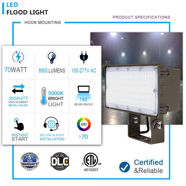 Energy Saving Flood Lights Outdoor, Each of them can replace 210W traditional halogen bulb by 70w LED, save 80% on electricity bill of lighting.Waterproof Led Lights with UL Listed Cord: IP65 waterproof rating ensures that your led outdoor flood light won’t give in to the elements. No matter the weather, LED floodlight can handle it.Efficent Cooling & Long Lifespan,The Flood light fixture is designed with a fin type heat sink, which means it acts like a radiator to dissipate heat And extremely long life 50000 Hours to reduce re-lamp frequency. Save labor cost to replace bulbs with short lifespan Super Bright Floodlights for Outside, Bright Flood lights can be used in backyard, yard, gardens, squares, factories, stadiums and other places.Save money perfect replacement,Commercial grade,The LED stadium lights outdoor are commercial grade, Outdoor LED Flood Lights are IP65 waterproof shatter resistant and anti-corrosion protected, meaning that they are the perfect outdoor LED lighting solution.Flexible installation,The outdoor security lights come with adjustable metal bracket, it can be installed on the ceiling, walls, ground and other locations, adjusting the different angles.