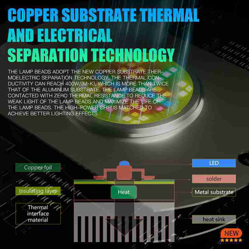 The lamp beads adopt the new copper substrate thermoelectric separation technology, and the thermal conductivity can reach 400W/(M·K), which is more than twice that of the aluminum substrate. The lamp beads adopt zero thermal resistance contact to reduce the weak light of the lamp beads and maximize the life of the lamp beads. With high-power chips, better lighting effects can be achieved.