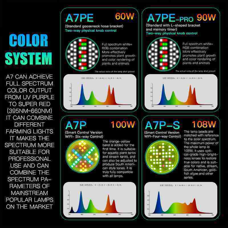 A7 can achieve full spectrum color output from ultraviolet to ultra-red (395NM~660NM), and can be combined with different agricultural lights to make the spectrum more suitable for professional use. It can combine the spectral parameters of mainstream popular lamps on the market.