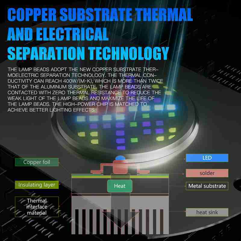 The lamp beads adopt the new copper substrate thermoelectric separation technology, and the thermal conductivity can reach 400W/(M·K), which is more than twice that of the aluminum substrate. The lamp beads adopt zero thermal resistance contact to reduce the weak light of the lamp beads and maximize the life of the lamp beads. With high-power chips, better lighting effects can be achieved.