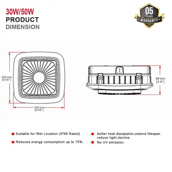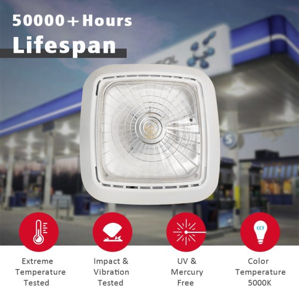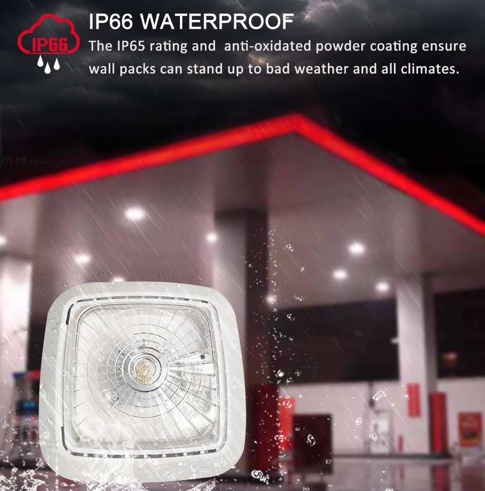 WELL-CONSTRUCTED & LONG LIFETIME,This well-built lighting fixture has a popular, classic appearance. Its corrosion-resistant, die-casting aluminum housing provides better impact resistance and durability. With the high-power LED chips and efficient heat sink, this canopy led light will supply you with 50,000+ hours of dependable soft uniform light.APPLICATIONS,Our led wall pack lights are suitable for commercial, industrial as well as residential applications. Widely used for gas station, service station, underground, parking lot, warehouse, garage, work floor, factory and so on.CERTIFICATION & MORE FEATURES,This parking lot led canopy light is green and eco-friendly as it does not use mercury. Our Lights are etl, DLC certified and comes with 3 years of warranty. No UV or IR in the beam, easy to install and operate, energy-saving, long lifespan, safe to eyes, and instant start are the other features of our LED light.