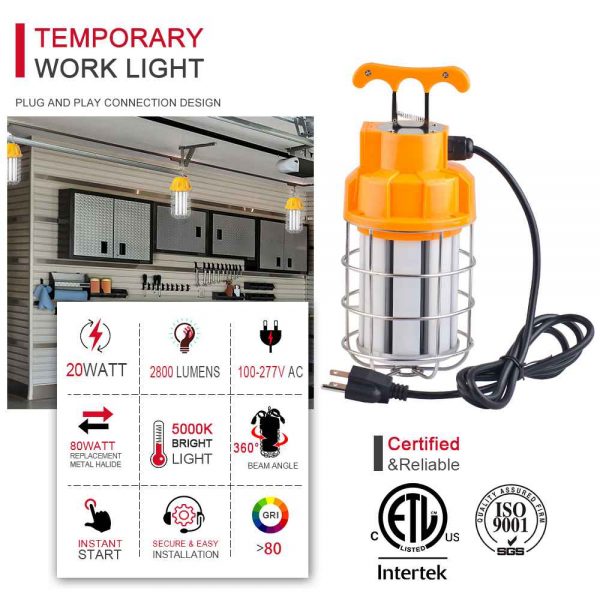 LED Portable Temporary Work Light 20W 2,600LM Linkable Construction Industrial Lighting UL Listed