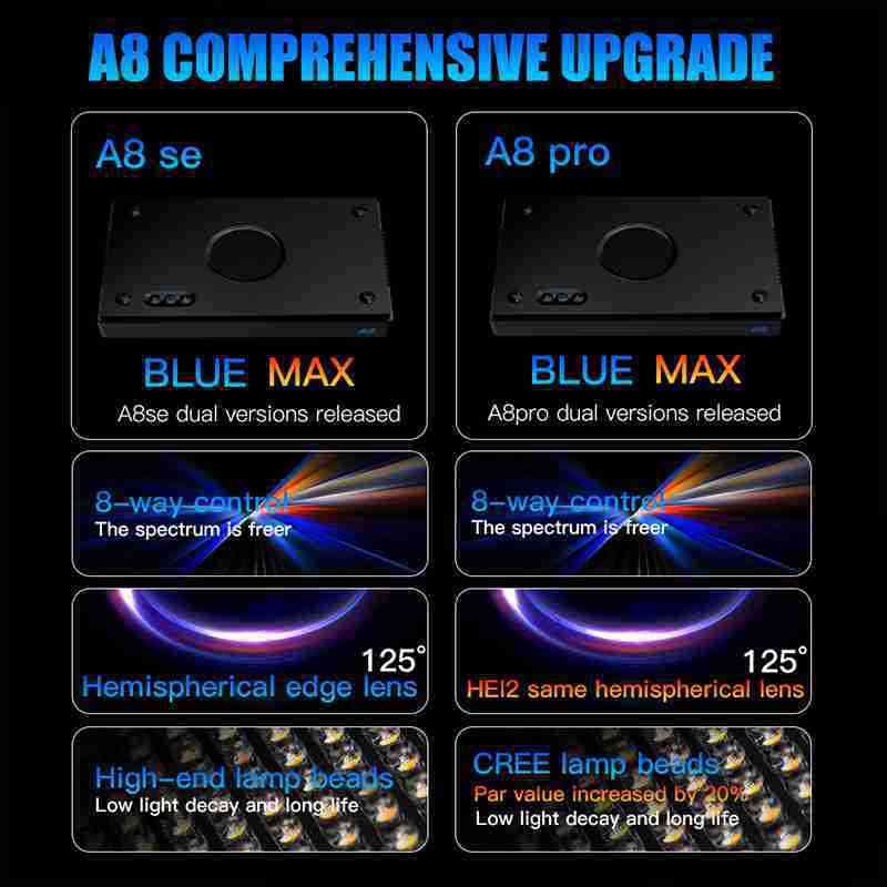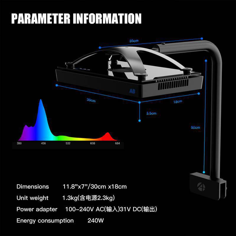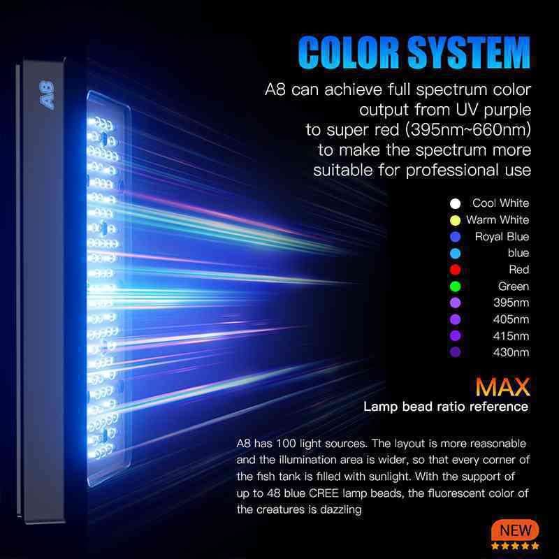 A8 has 100 light sources. The layout is more reasonable and the illumination area is wider, so that every corner of the fish tank is filled with sunlight. With the support of up to 48 blue CREE lamp beads, the fluorescent color of the creatures is dazzling.