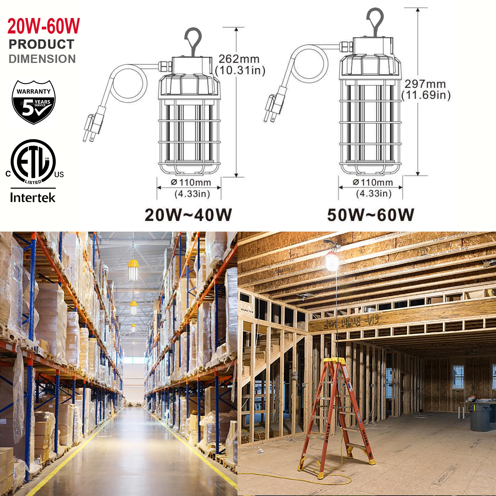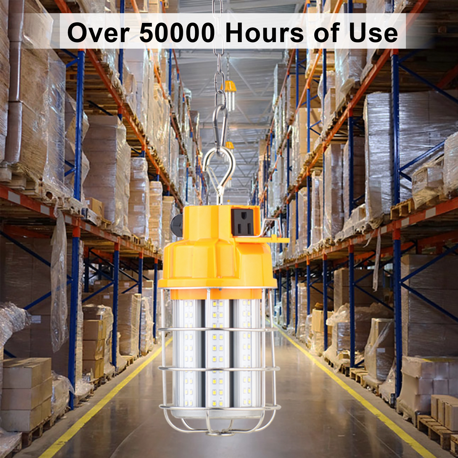 Versatile,LED portable work light comes with a steel safety snap lock make it quick and easy to install or remove. It can be an efficient LED High Bay Light, or be a temporary work lighting,Better Design,Designed for better heat dissipation with unique aluminum Heat Sink. An integrated driver means you no longer have to spend more money on external ballasts. Rated over 50,000 hours of use(23years,based on 6 hrs/day). With no bulbs to break or replace, this portable light will always be ready to work for you.DURABLE and HASSLE FREE WARRANTY,5 YEAR WARRANTY. ETL & DLC Certification with outstanding quality standards provides efficient lighting and adds extra safety.Your satisfaction is 100% guaranteed.Contact us for an easy and fast replacement.